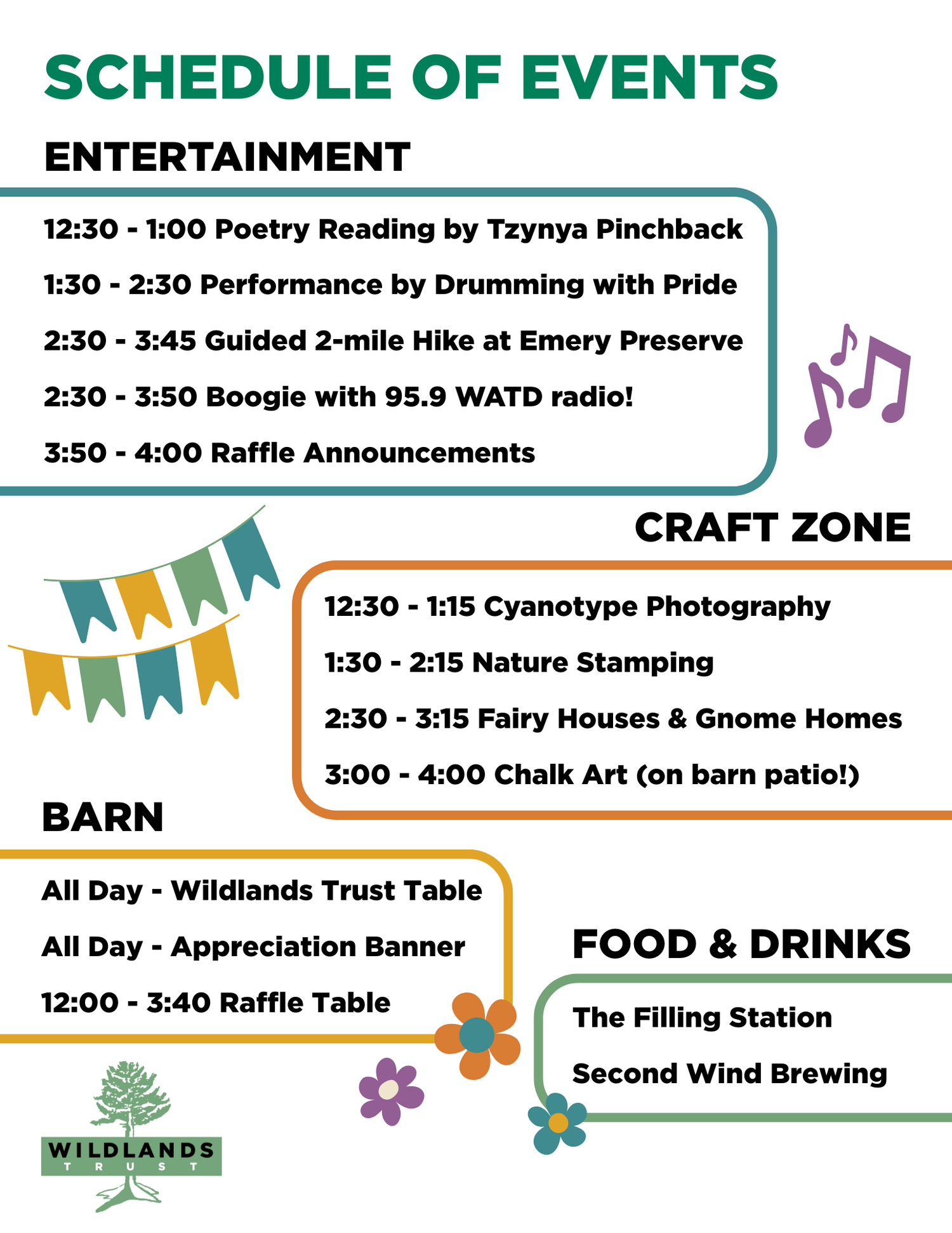 We will have a rotating schedule throughout the day. We have entertainment, including a poetry reading by Plymouth-based poet Tzynya Pinchback, a performance by Drumming with Pride, and afternoon music with 95.9 WATD at our outdoor stage. For all creatives at heart, we have a craft zone for chalk art, cyanotype printing, nature stamping, and building fairy and gnome homes. Want to get out on the trail? Explore Emery Preserve on an afternoon 2-mile hike with Wildlands Trust’s volunteer hike leaders, or start the day early by hiking to the fun with a 6-mile hike on 8 Ponds Pass trail. Enjoy food from The Filling Station and beverages from Second Wind Brewing Company while basking in the sun in our Adirondack chairs. Be sure to enter for a chance to win in a riveting raffle showcasing local businesses and our membership program partners!