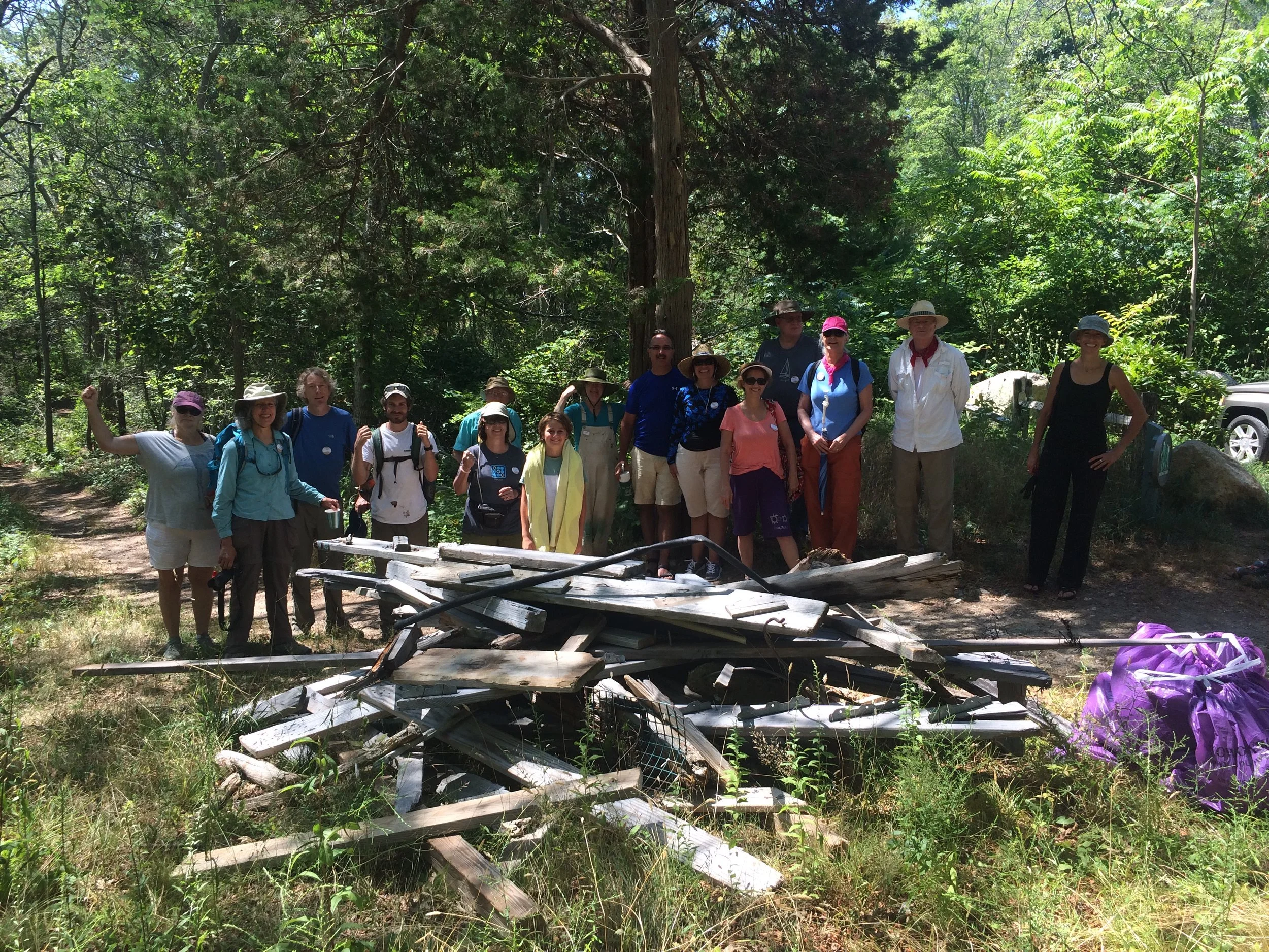 During the week, these dedicated volunteers not only restored Cotton Pond Trail, but spend time doing service projects all over Plymouth. Here at the Wildlands Trust headquarters, they completed of a compost bin, benches which will be installed on various preserves, and the transplant and seeding of a new pollinator garden. The next morning, a giant pile of wood from a washed up dock and other trash was hauled about a half a mile from the beach to the trail head at Plymouth's Center Hill Preserve.