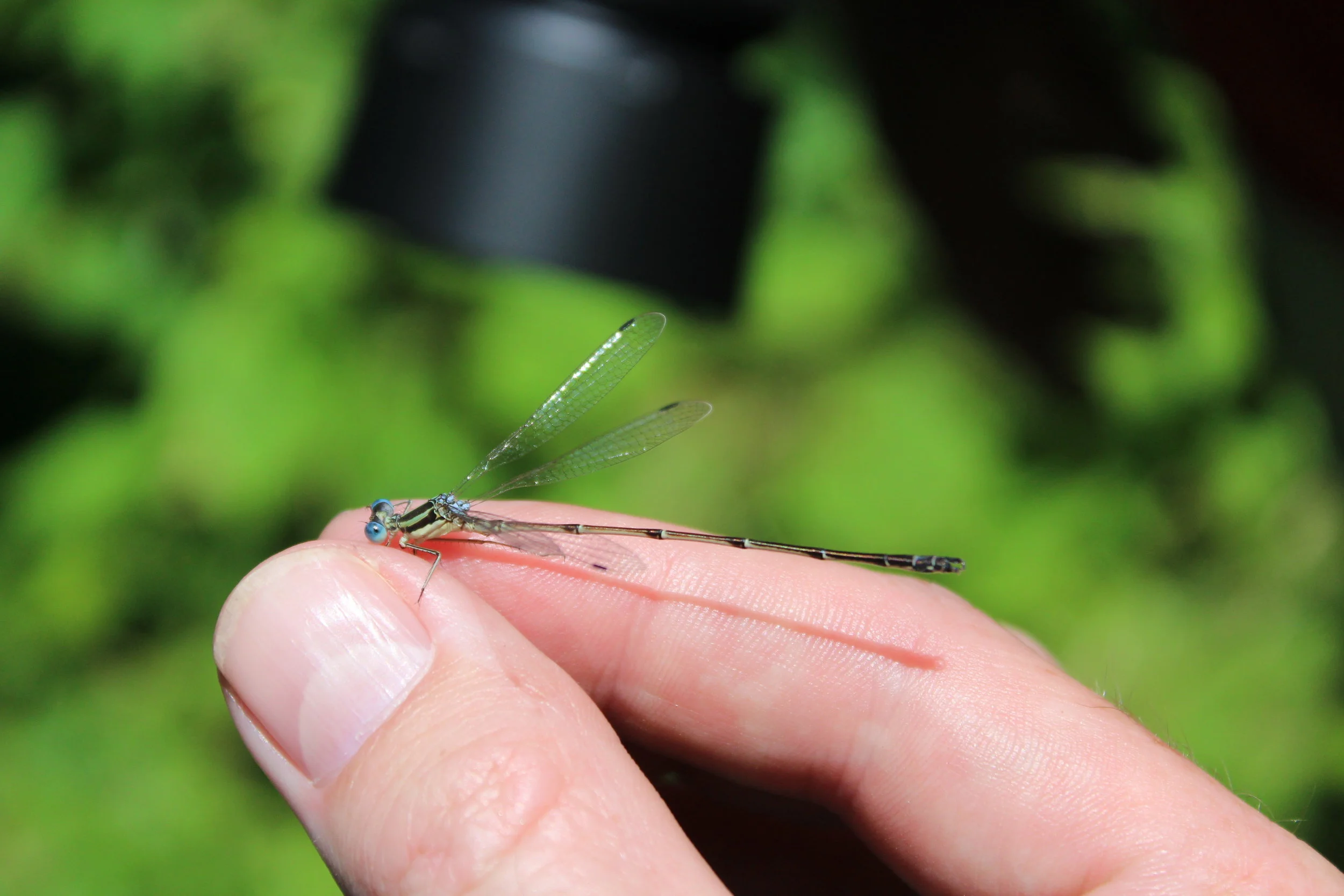A damselfly, caught in Nick Block's insect net, Great River Preserve, Bridgewater