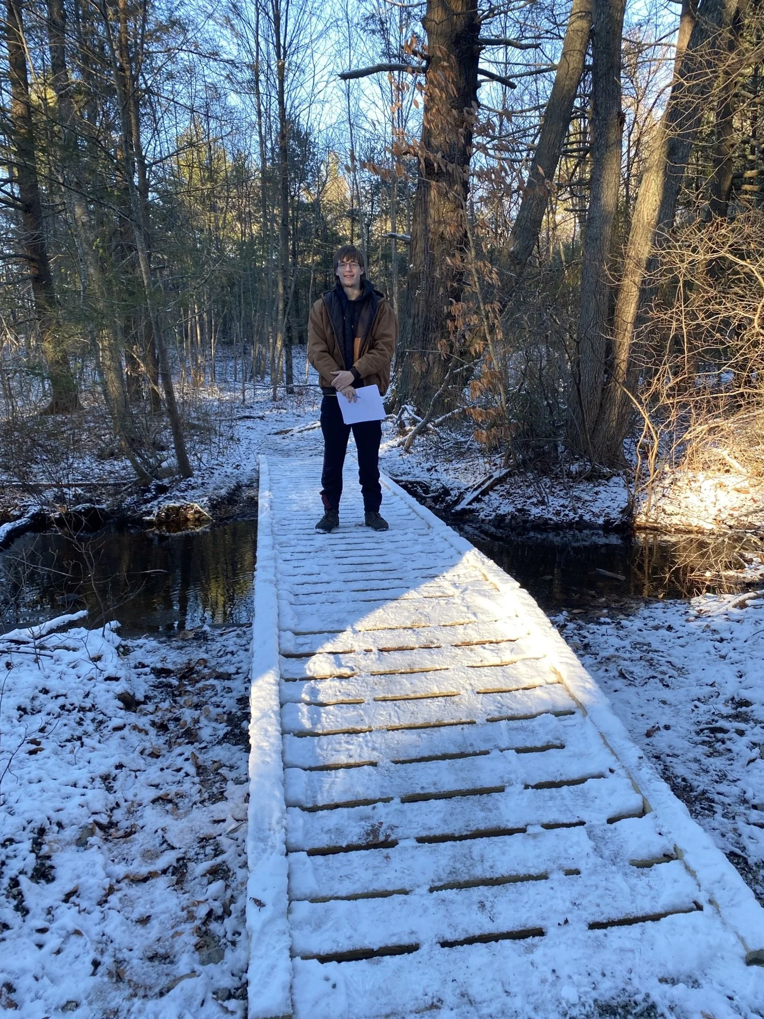 Eagle Scout candidate Max Cunniff standing on the newly completed 20-foot-long bridge across the Drinkwater River at town-owned Melzar Hatch Preserve in Hanover.