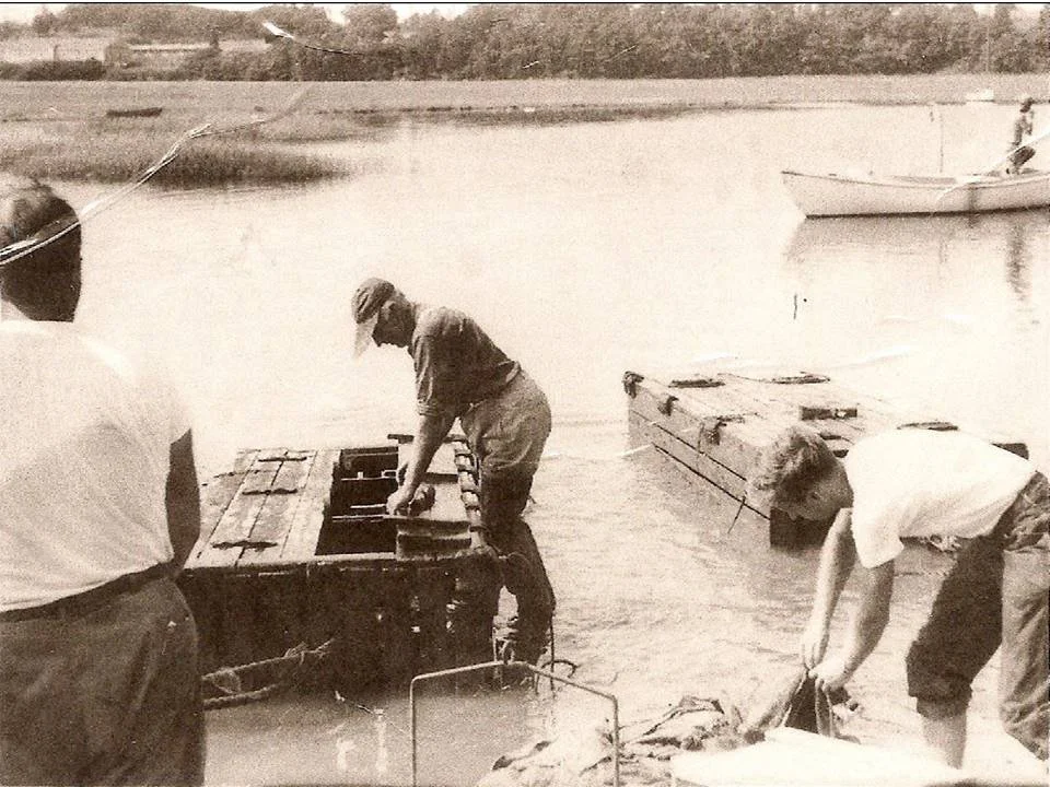Al Marsh (lower right) and his father Percy Marsh (center) working with the lobster cars in Ellisville Marsh in the 1940s. Photo courtesy of the Marsh family, via Friends of Ellisville Marsh. Read more about Al’s story in his 2020 account, “Ellisville History,” linked in the “Learn More” section below.