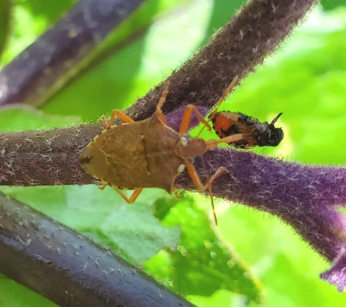 A soldier bug with its quarry, a potato beetle larva. We appreciate the assistance with one of our worst pests.