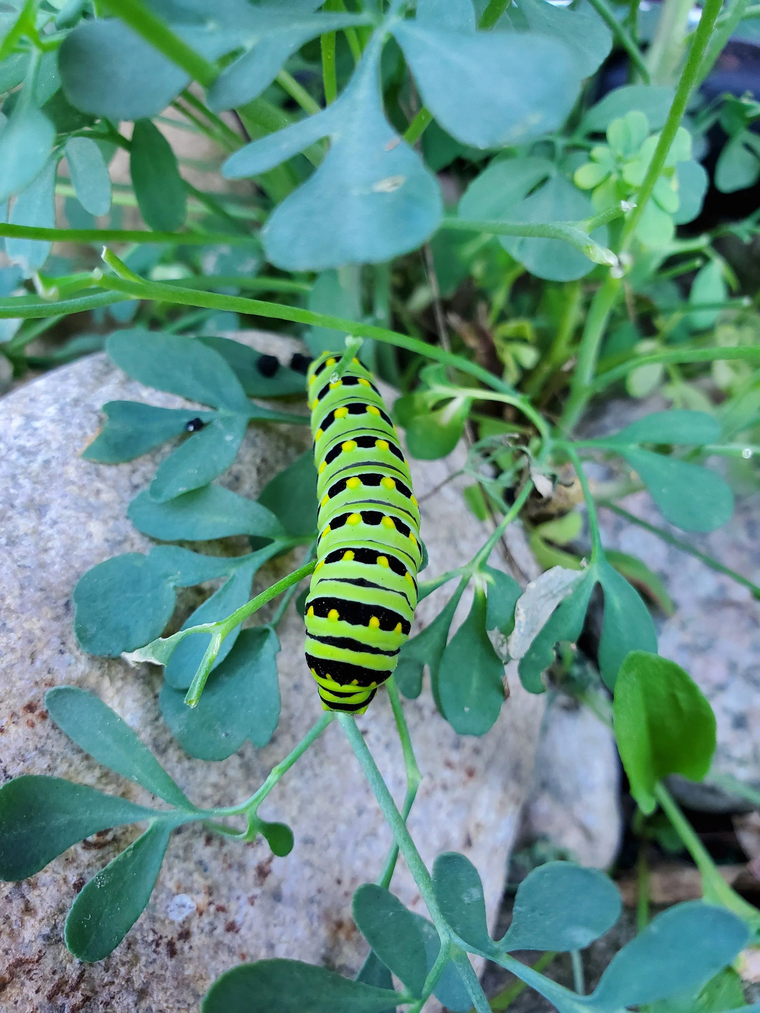 Swallowtail caterpillar on rue. Though they largely eat members of the carrot family, they rarely eat enough to be a problem. We don't eat the carrot greens, anyway.
