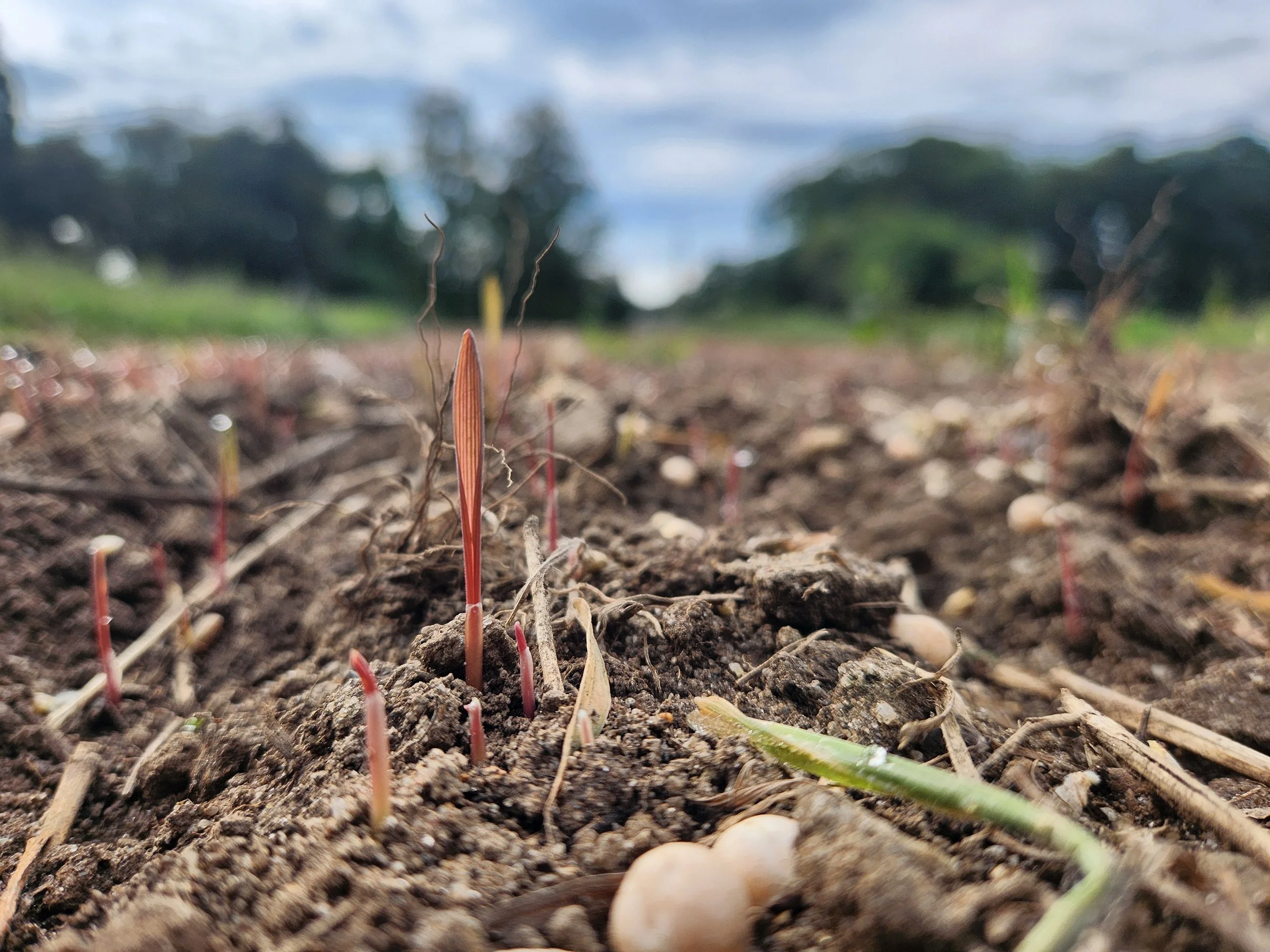 Winter rye germinates alongside field peas, both used as cover crops to protect the soil.