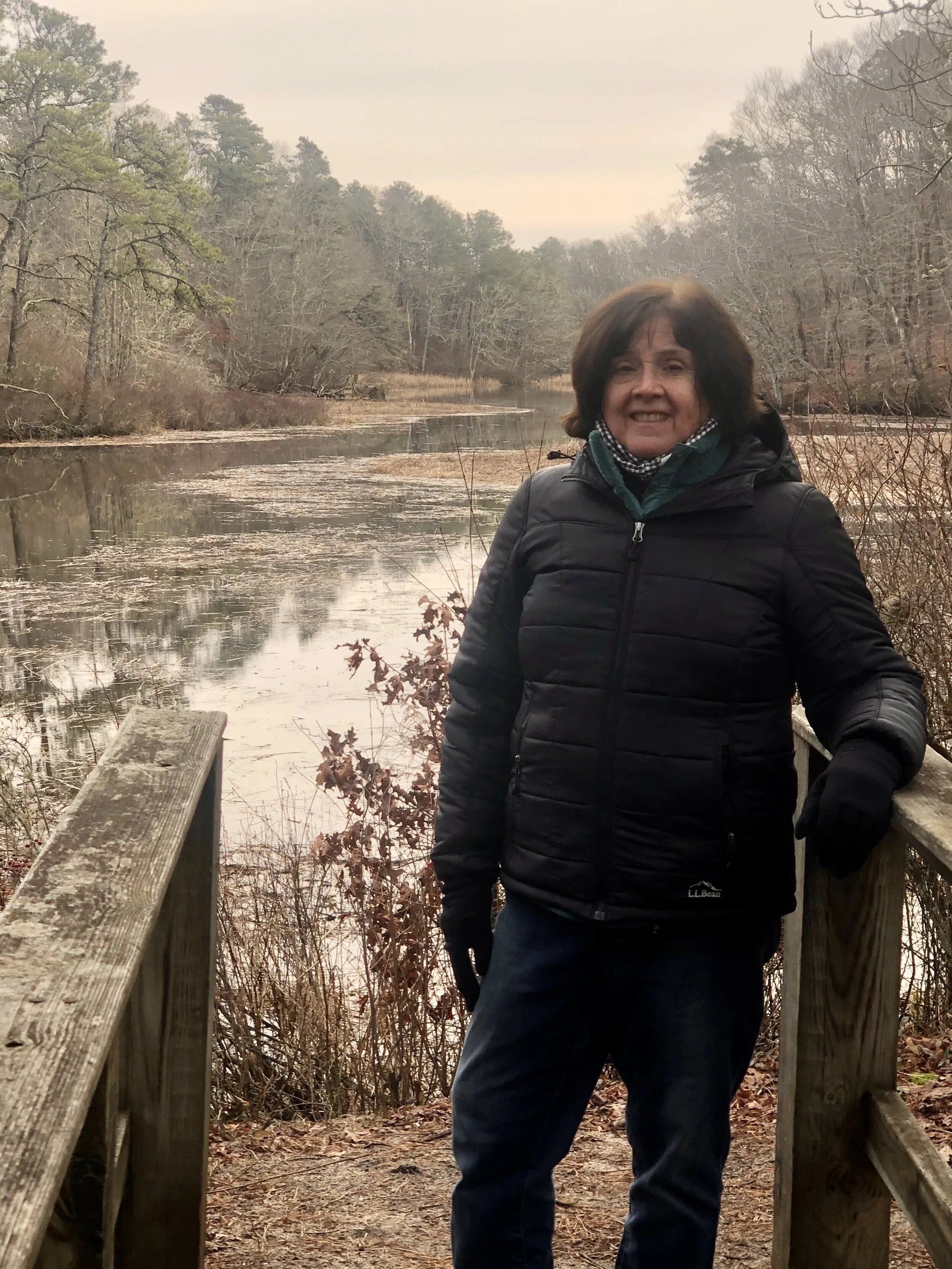 Cindy in front of the Mashpee River at Mashpee River Reservation.