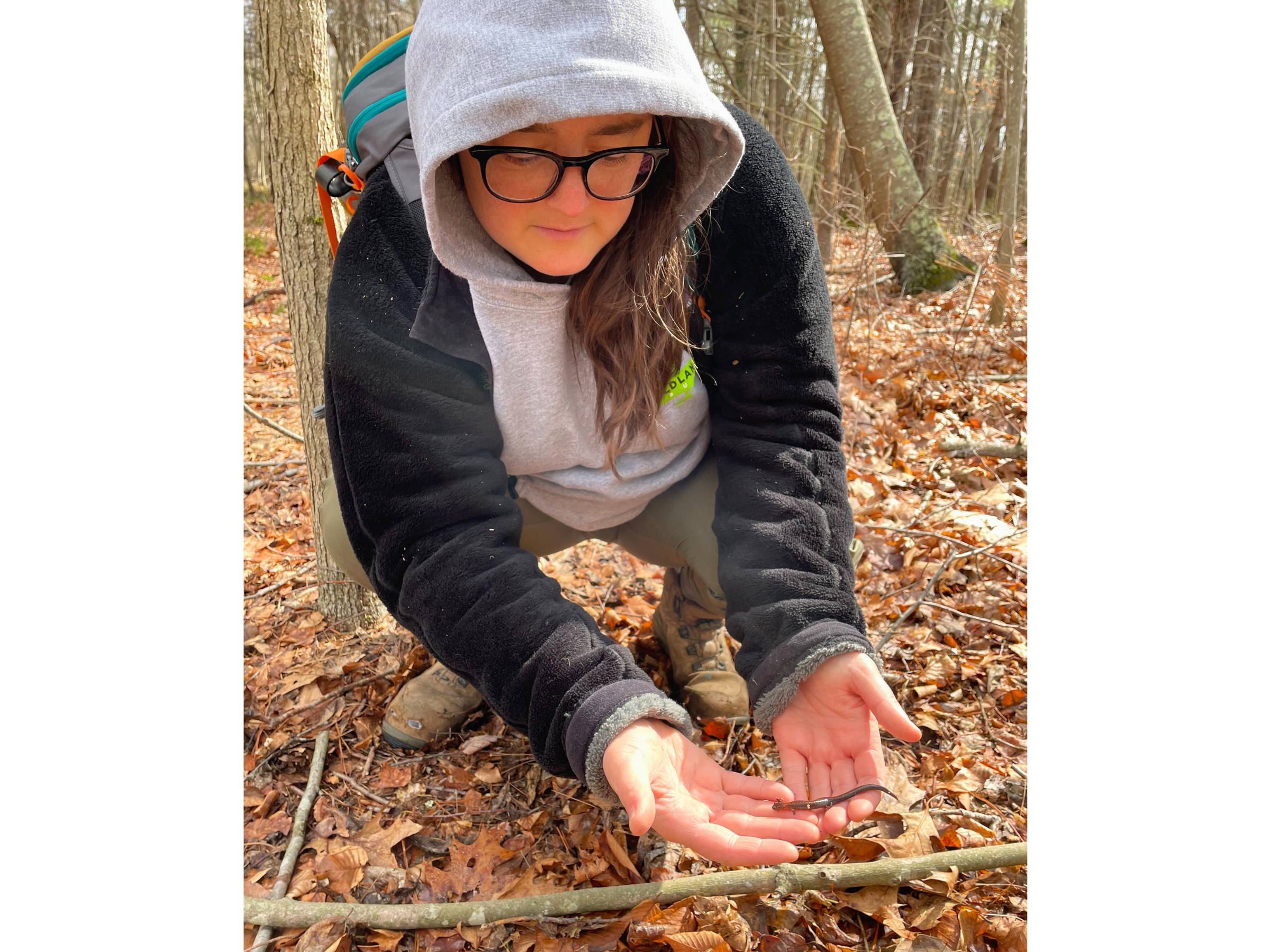 Stewardship Programs Manager Zoë Smiarowski handles a red-backed salamander at Striar Snake River Preserve in Taunton.